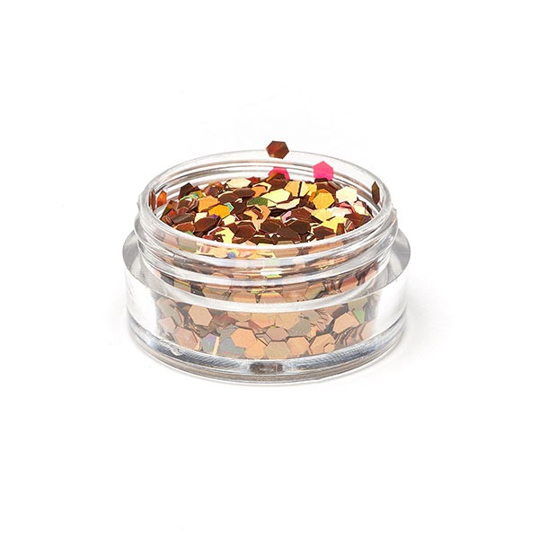 The glitter is hexagonal cut in 1mm, 2mm and 3mm (diameter).